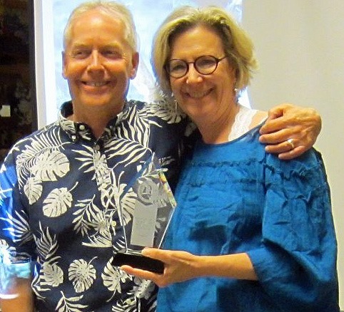 Patagonia Books Director Karla Olson presents the Ben Franklin Book Award to Jim.